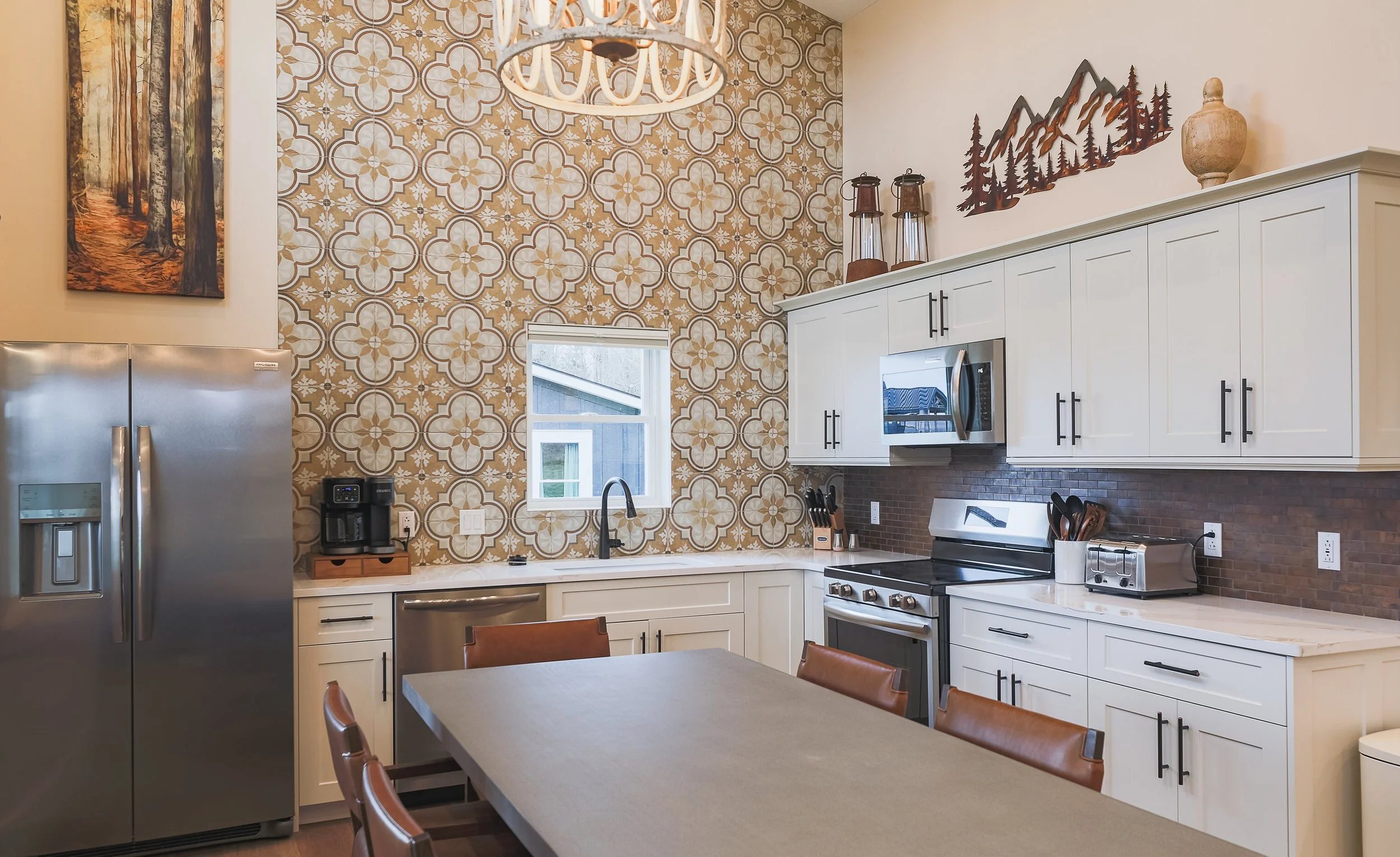 Modern kitchen with patterned tile wall, stainless steel appliances, white cabinets, a large dining table with brown chairs, and decorative items.
