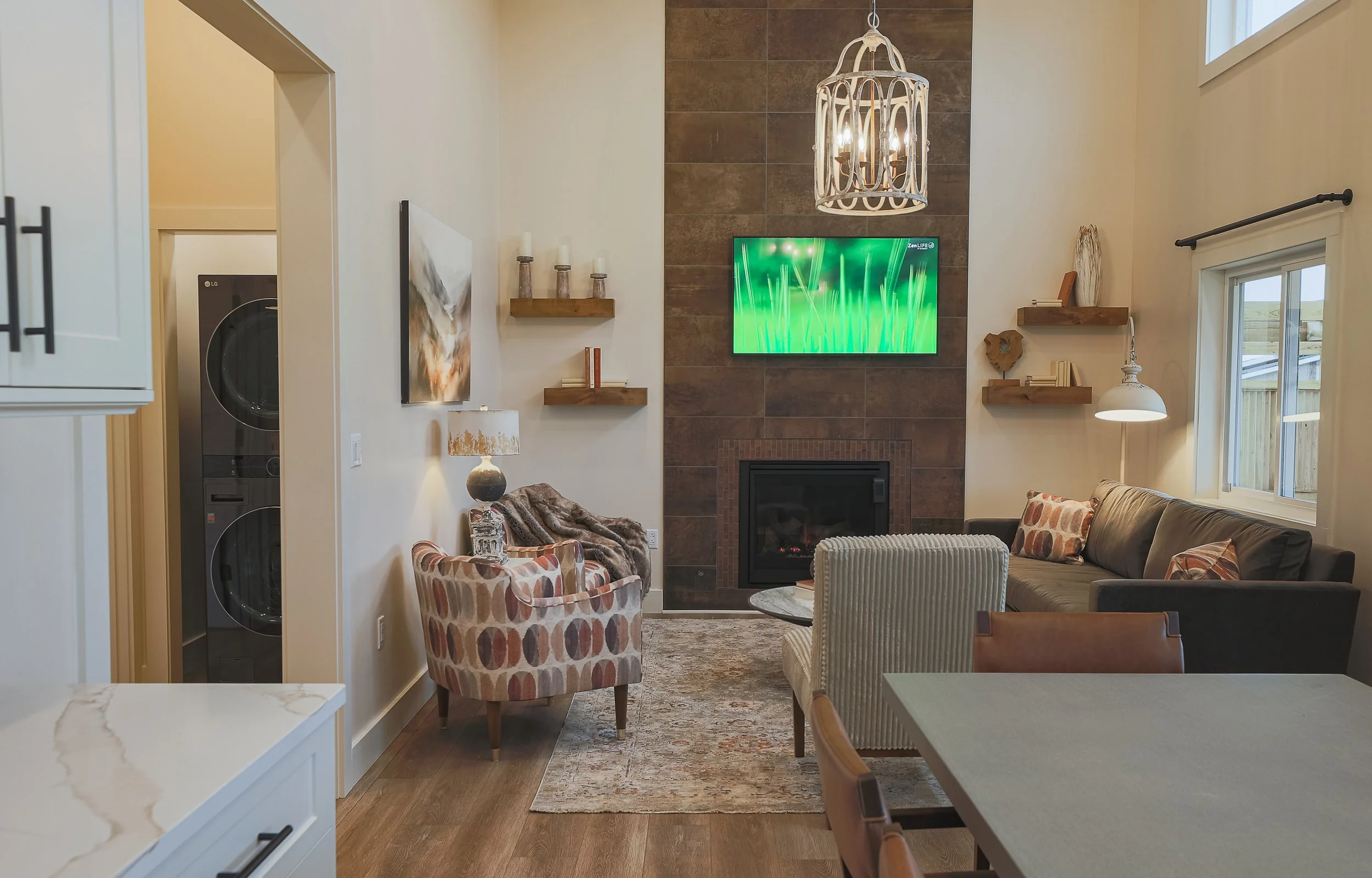 Modern living room with fireplace, TV, armchairs, sofa, and decorative shelves. Adjacent laundry area with stacked washer and dryer. Pendant light and decorative throw pillows enhance the cozy atmosphere.